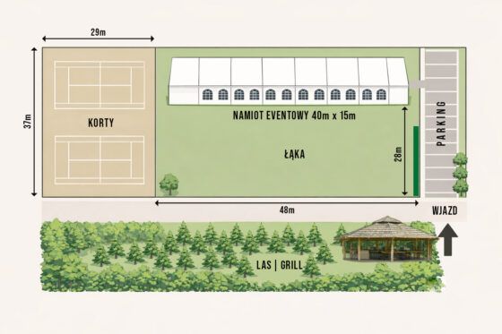 Namiot eventowy o powierzchni 600 m. kw. i łąka piknikowa to idealna przestrzeń na organizację firmowych pikników, eventów plenerowych czy integracji wśród natury.